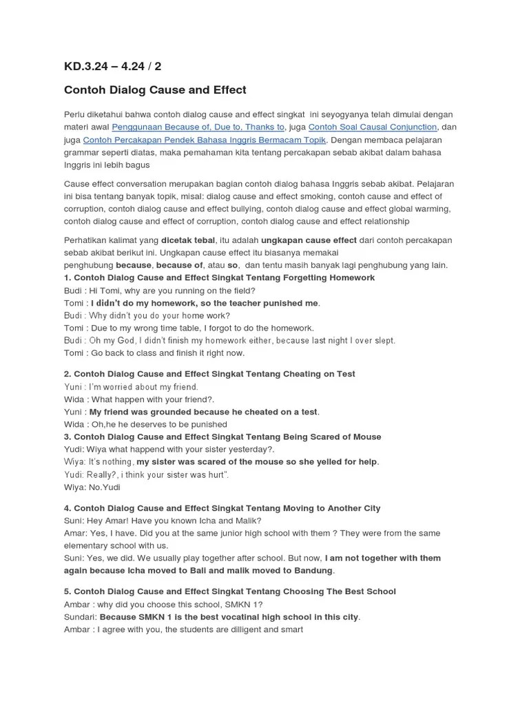Pembahasan dan contoh penggunaan kata hubung sebab akibat, cause effect. Dibawah ini adalah essay atau . Kalimat cause and effect secara makna dalam bahasa indonesia yaitu kalimat yang mengandung sebab dan akibat dari suatu kejadian dalam kehidupan . Cause effect conversation merupakan bagian contoh dialog bahasa inggris sebab akibat. Dalam bahasa inggris, arti dari kalimat cause and effect adalah sebab akibat.